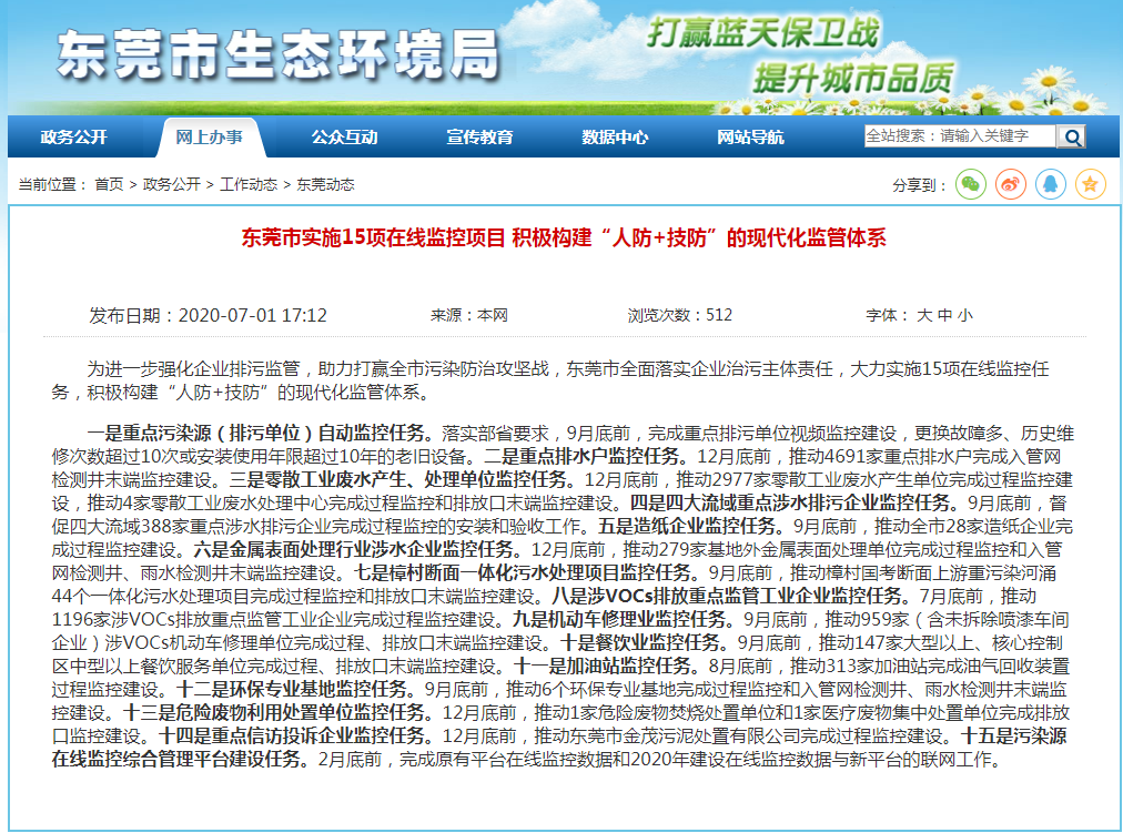 為進一步強化企業(yè)排污監(jiān)管,助力打贏全市污染防治攻堅戰(zhàn),東莞市全面落實企業(yè)治污主體責任,大力實施15項在線監(jiān)控任務,積極構建“人防+技防”的現代化監(jiān)管體系。