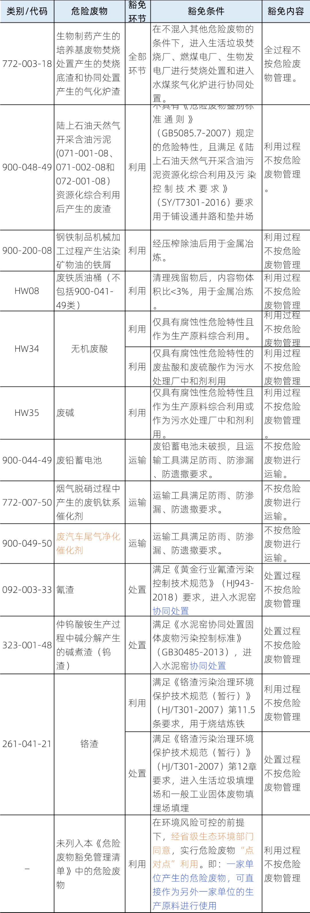 ( 1 )新增 13 種危險廢物。其中,1 種危險廢物為全環節豁免,9 種危險廢物為利用或處置環節豁免,3 種危險廢物為運輸環節豁免。